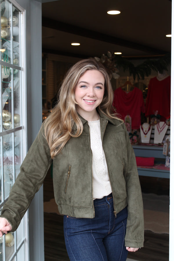 Add a touch of edge to your look with our olive moto jacket — featuring sleek zip details and a flattering fit, it’s the perfect layer for any season