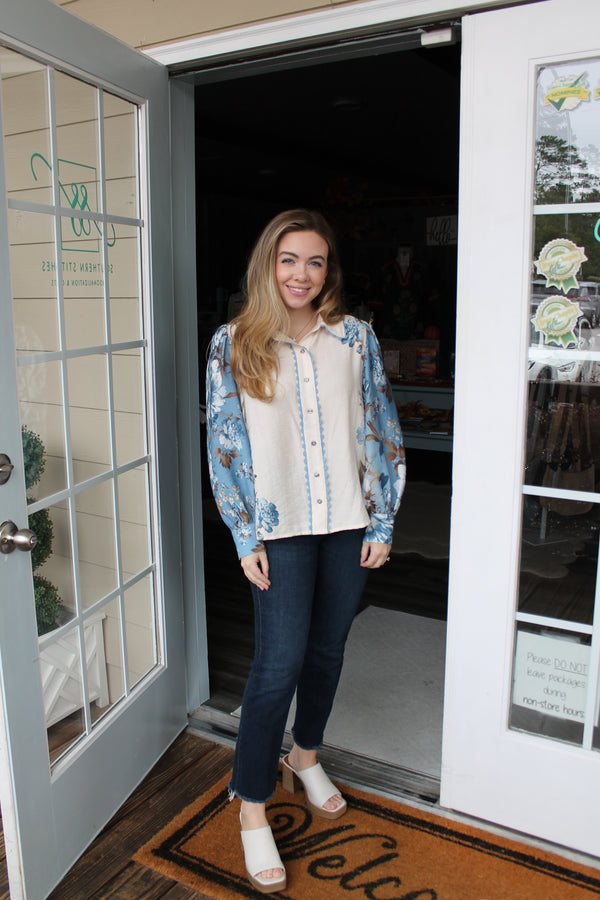 A cheerful blue floral blouse that's easy to love. Soft, stylish, and ready for anything—from casual days to dressed-up moments. Just slip it on and go!