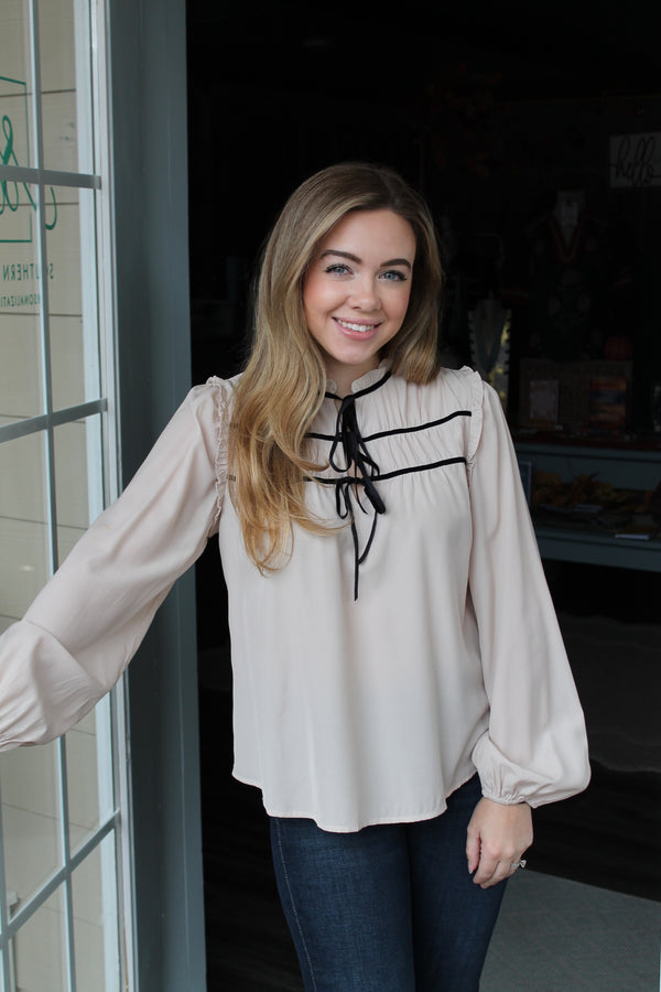 This Means Business Taupe Blouse combines understated elegance with refined details, featuring a luxurious velvet black trim that elevates its sophisticated appeal. The graceful balloon sleeves with elastic cuffs deliver both comfort and contemporary style, making this piece an essential addition to any discerning wardrobe.
